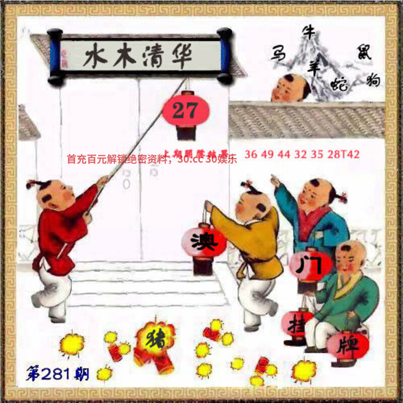 281期正版彩图挂牌:挂:27 爆:猪 挂牌成语:水木清华 挂牌出肖:牛马蛇狗羊鼠