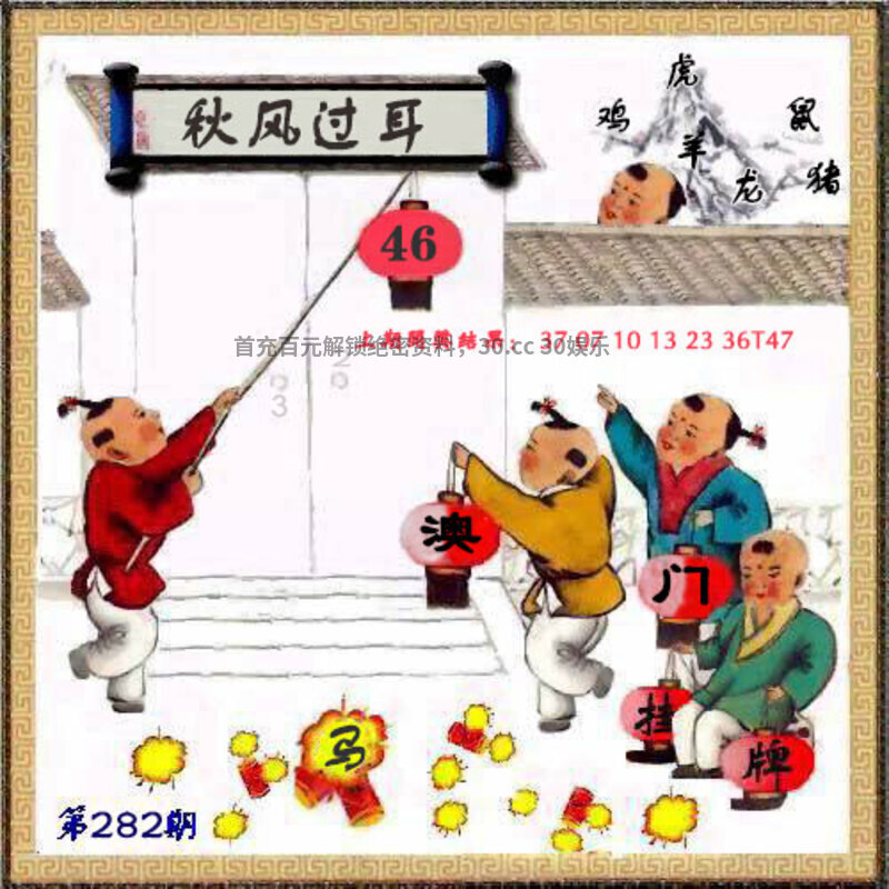 282期正版彩图挂牌:挂:46 爆:马 挂牌成语:秋风过耳 挂牌出肖:虎鼠龙羊鸡猪